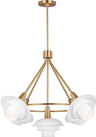 This 5-light chandelier by Ellen Degeneres for Generation Brands is a part of the Rossie collection and comes in a burnished brass finish.