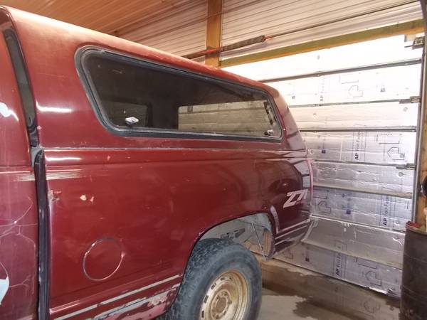 '88-'98 (some '99-2000) GMC/CHEVY short Box Topper for sale, $250 Cash, located in Aberdeen. NO text NO emails, calls only (see pics). Decent shape, lil peeling clear coat on the top, Have key. Box is also for sale with gate and lights, $500. Box is 99.5% rust free.