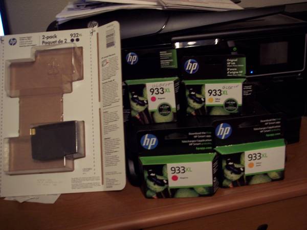 Extra HP 932/933 printer ink from a HP 6600 printer. Printer head went bad. Will fit other certain HP printers. I opened the boxes to the oldest of the cartridges. And wrote oldest on the boxes. Also, the cartridges from the printer included. The one picture shows the amount remaining in those. $50 Obo. cash or PayPal. Can ship.